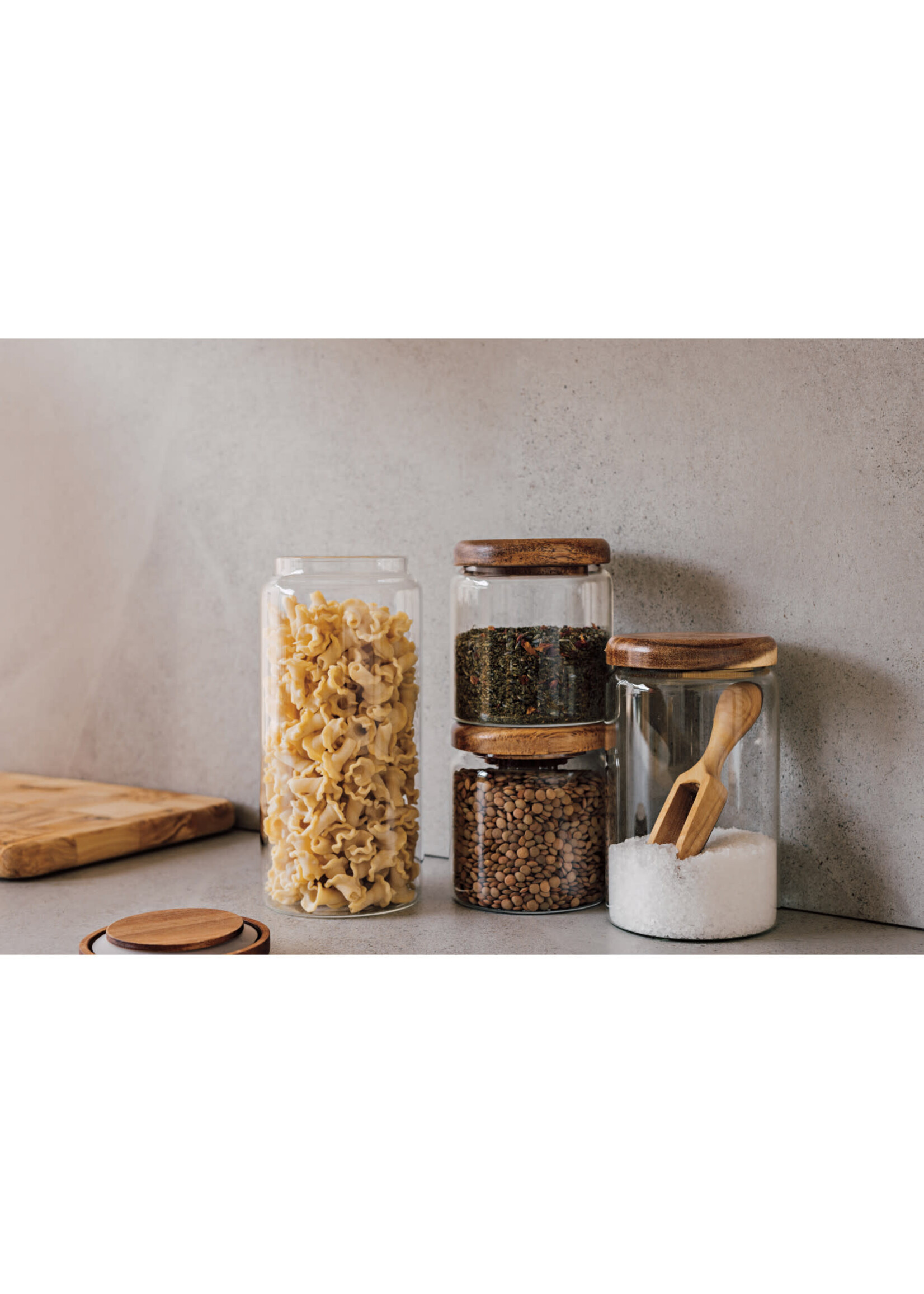This glass jar with acacia wood lid offers an elegant food storage solution. Made of food-safe materials, this jar is stylishly suitable for use in and out of the kitchen. Features a wide mouth and silicone rubber seal to preserve freshness.